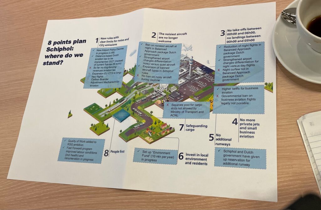 Er werd gesproken over het 8 puntenplan van Schiphol en over hoe Schiphol in de toekomst een ‘goede buur’ wil zijn voor de omgeving. Er werd tevens gesproken over de gezondheidseffecten die de luchtvaart in de omgeving veroorzaakt. De status van het 8 puntenplan heeft van Oord meegenomen in een ‘handout’ en is hieronder afgebeeld.